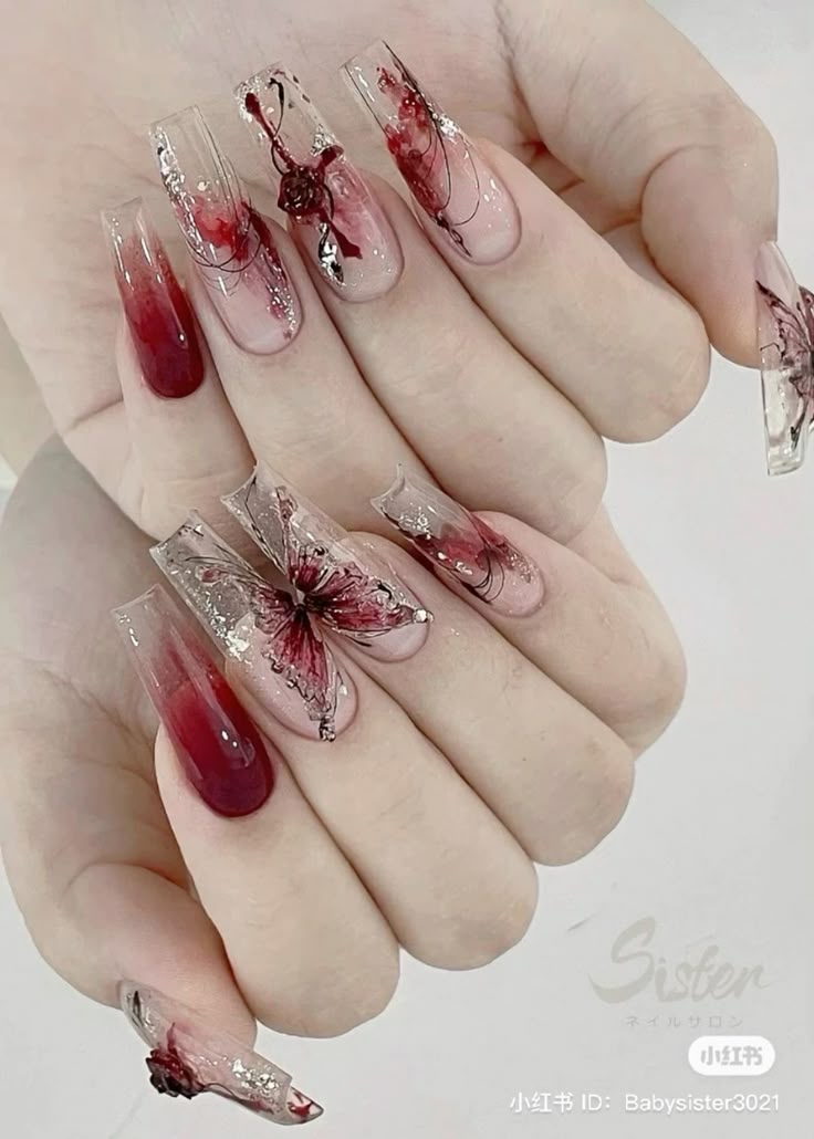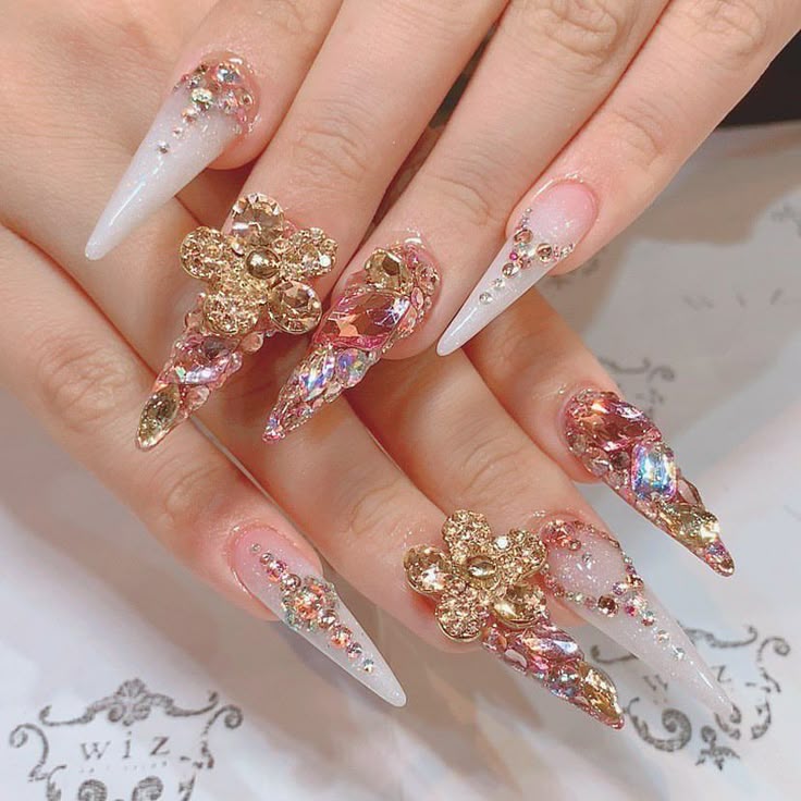 Sentuhan glamor dengan taburan aksen perhiasan mini, bikin kuku jadi pusat perhatian di acara spesial.